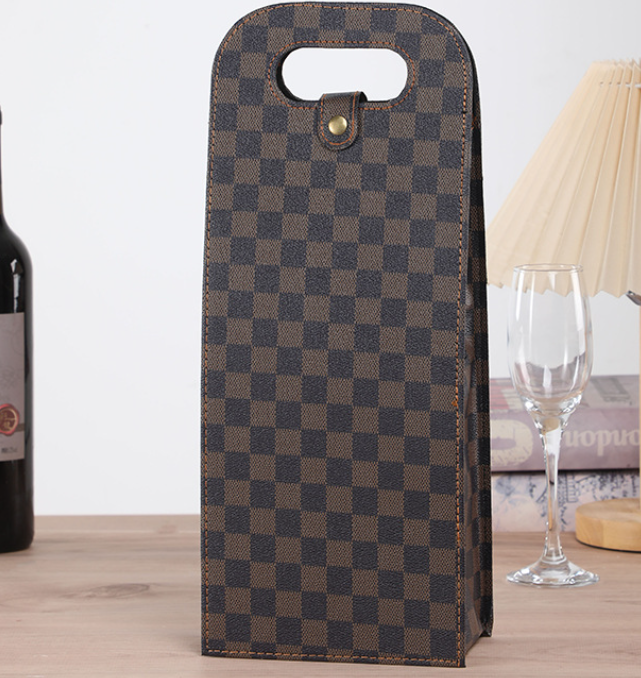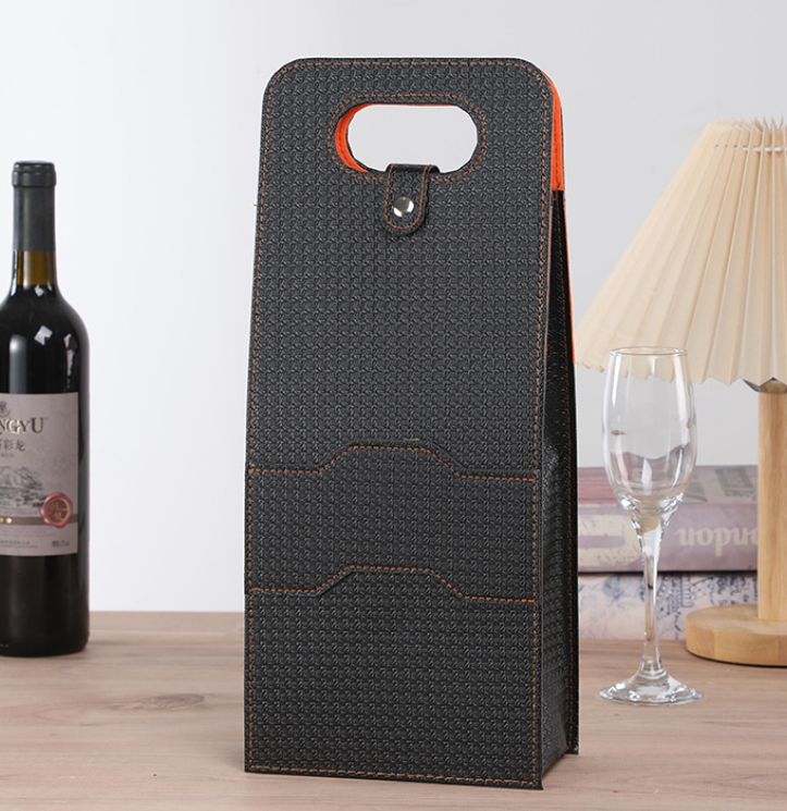 Custom Single or Double Luxury PU Leather Wine Bottle Gift Packaging Bag with Metal Button Closure for Beverages
