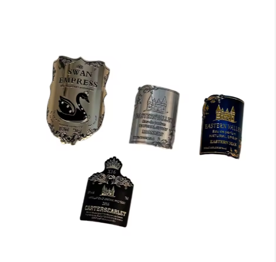 Factory Sell Self Adhesive Bright Black Embossed Curved Aluminum Metal Stickers Liquor Wine Perfume Bottle Label Aluminum Labels
